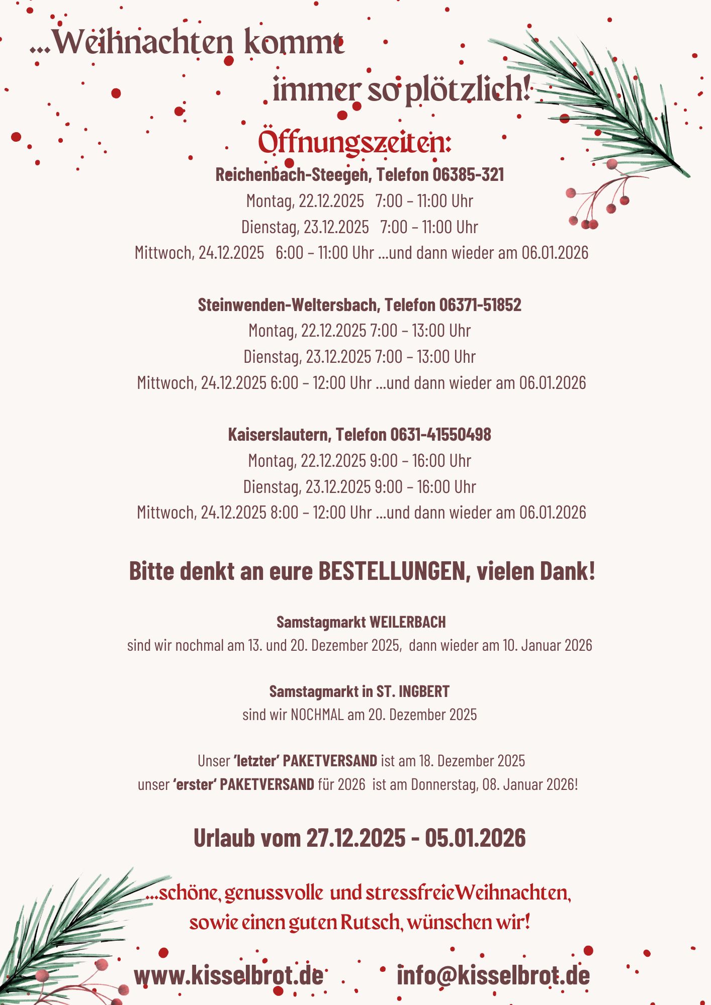 Wir haben Urlaub vom 25. Dezember 2025 bis 5. Januar 2026